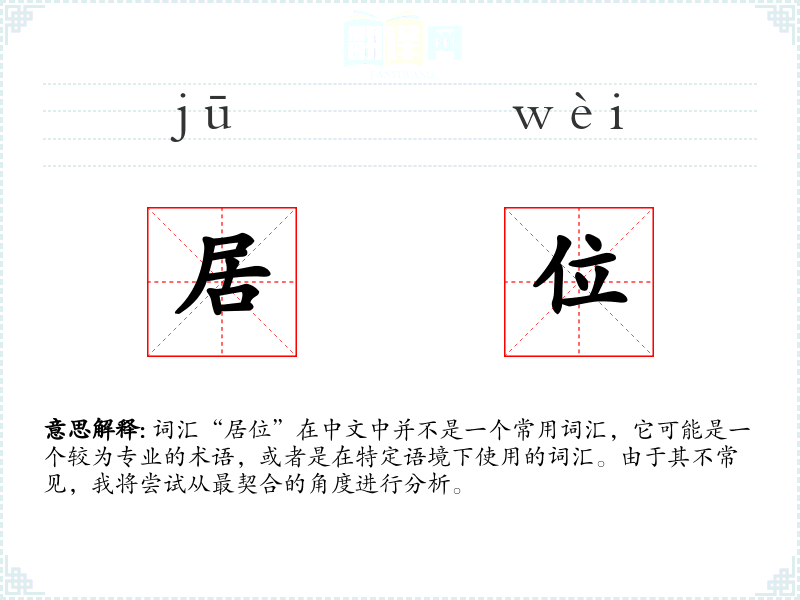 词汇“居位”在中文中并不是一个常用词汇,它可能是一个较为专业的术语,或者是在特定语境下使用的词汇。由于其不常见,我将尝试从最契合的角度进行分析。