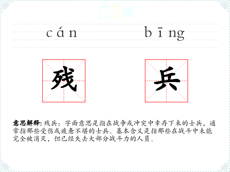 残兵:字面意思是指在战争或冲突中幸存下来的士兵,通常指那些受伤或疲惫不堪的士兵。基本含义是指那些在战斗中未能完全被消灭,但已经失去大部分战斗力的人员。