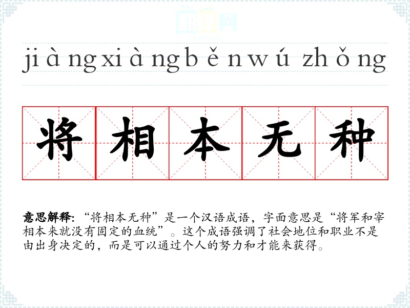 “将相本无种”是一个汉语成语,字面意思是“将军和宰相本来就没有固定的血统”。这个成语强调了社会地位和职业不是由出身决定的,而是可以通过个人的努力和才能来获得。