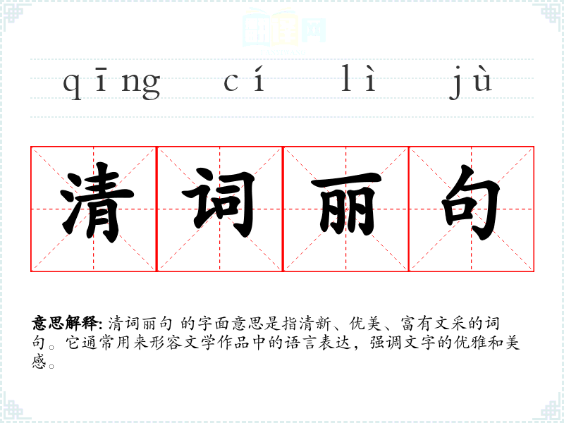 清词丽句 这个词组由“清词”和“丽句”两个词组成。“清”字在这里表示清新、纯净,“丽”字表示美丽、优美。这个词组在古代文学批评中就已经出现,随着时间的推移,其含义和用法逐渐固定下来。