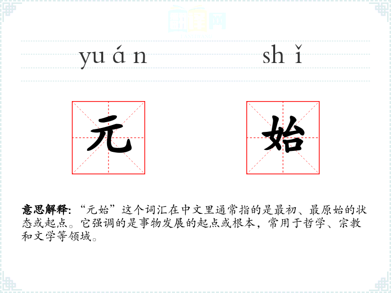 - 口语:在日常口语中,“元始”较少直接使用,但如果提到,通常是指某个过程或事物的最初阶段。