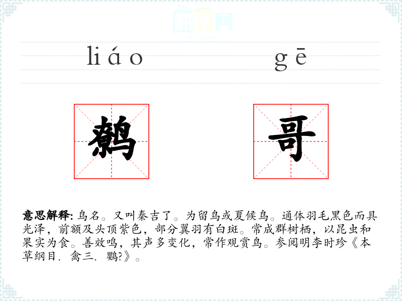 鸟名。又叫秦吉了。为留鸟或夏候鸟。通体羽毛黑色而具光泽,前额及头顶紫色,部分翼羽有白斑。常成群树栖,以昆虫和果实为食。善效鸣,其声多变化,常作观赏鸟。参阅明李时珍《本草纲目.禽三.鹦?》。