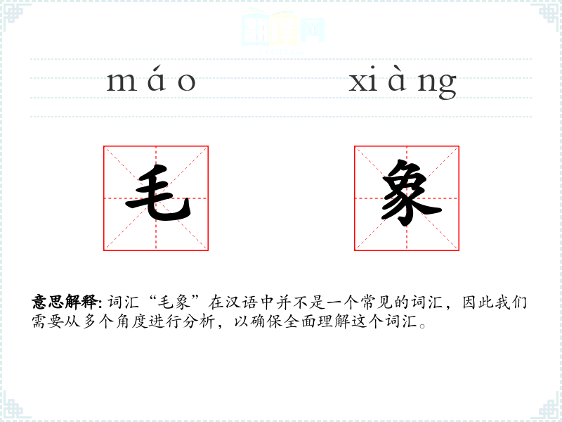 词汇“毛象”在汉语中并不是一个常见的词汇,因此我们需要从多个角度进行分析,以确保全面理解这个词汇。