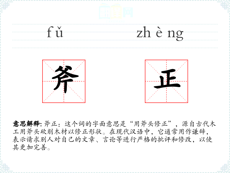 - 反义词:赞扬、肯定、褒奖(这些词与“斧正”在语义上相对立,因为“斧正”强调的是批评和修改)