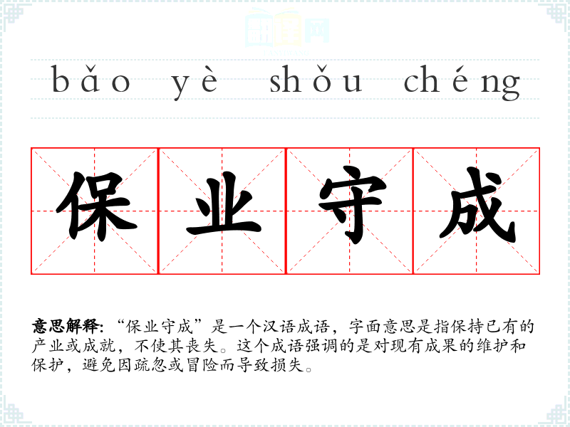 “保业守成”是一个汉语成语,字面意思是指保持已有的产业或成就,不使其丧失。这个成语强调的是对现有成果的维护和保护,避免因疏忽或冒险而导致损失。