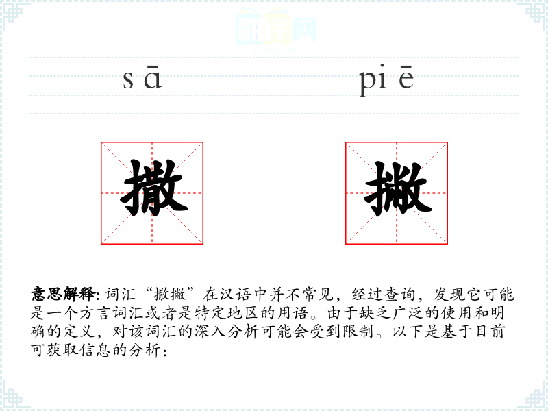 词汇“撒撇”在汉语中并不常见,经过查询,发现它可能是一个方言词汇或者是特定地区的用语。由于缺乏广泛的使用和明确的定义,对该词汇的深入分析可能会受到限制。以下是基于目前可获取信息的分析: