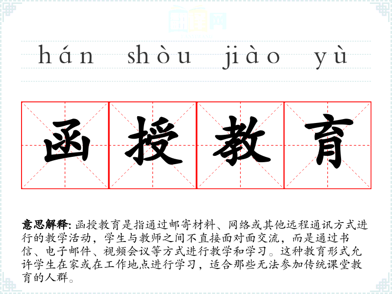 “函授”一词源于“函”(信件)和“授”(传授),最初指的是通过邮寄信件和学习材料进行的教学。随着技术的发展,函授教育的媒介也扩展到了电子邮件、视频会议等现代通讯方式。