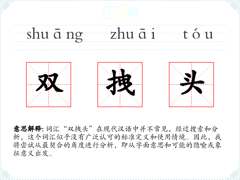 由于“双拽头”不是一个标准词汇,其词源和演变难以考证。它可能是某个特定语境下的创造性表达,或者是某个方言或俚语中的词汇。