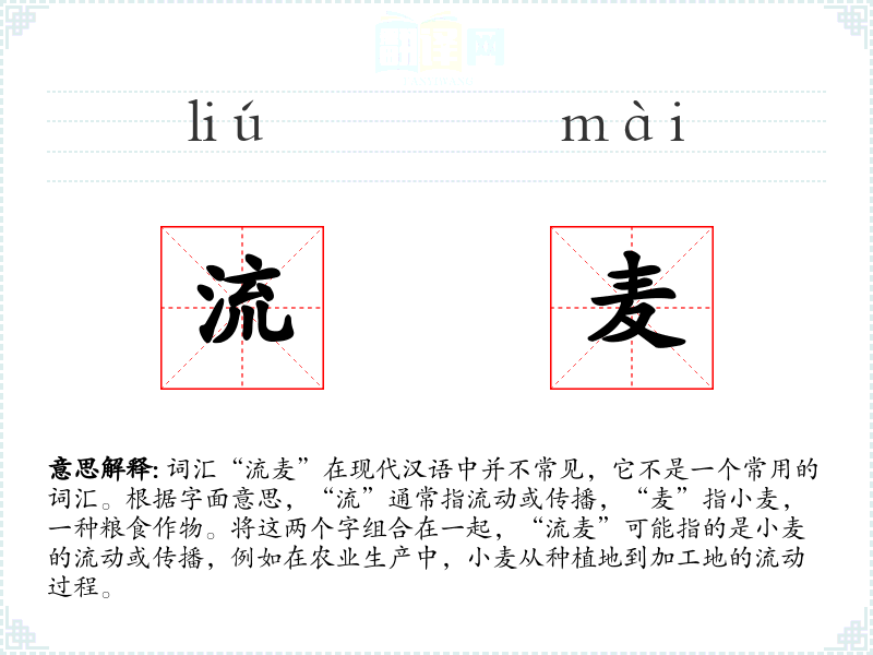 - 反义词:无(由于“流麦”不是一个常用词汇,反义词不明显)