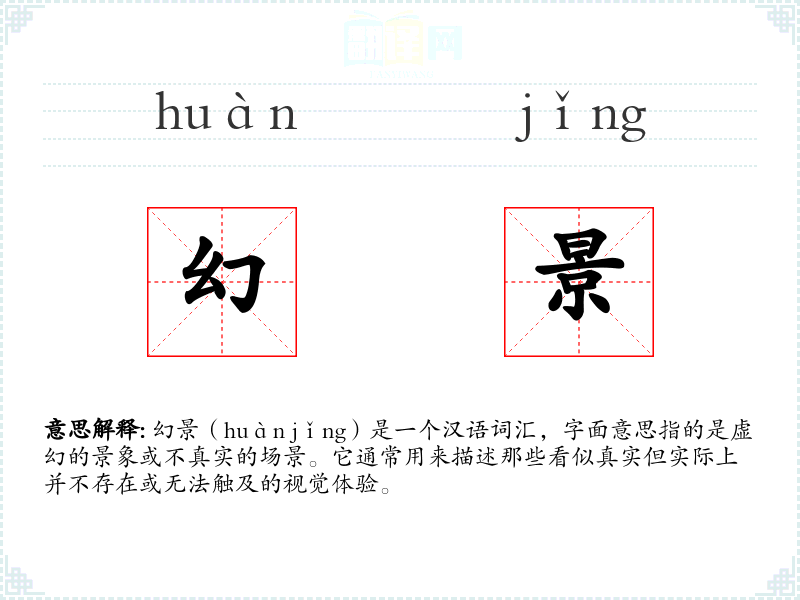 幻景(huàn jǐng)是一个汉语词汇,字面意思指的是虚幻的景象或不真实的场景。它通常用来描述那些看似真实但实际上并不存在或无法触及的视觉体验。