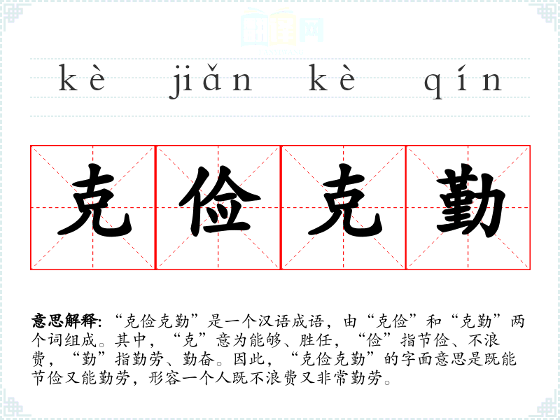 “克俭克勤”是一个汉语成语,由“克俭”和“克勤”两个词组成。其中,“克”意为能够、胜任,“俭”指节俭、不浪费,“勤”指勤劳、勤奋。因此,“克俭克勤”的字面意思是既能节俭又能勤劳,形容一个人既不浪费又非常勤劳。