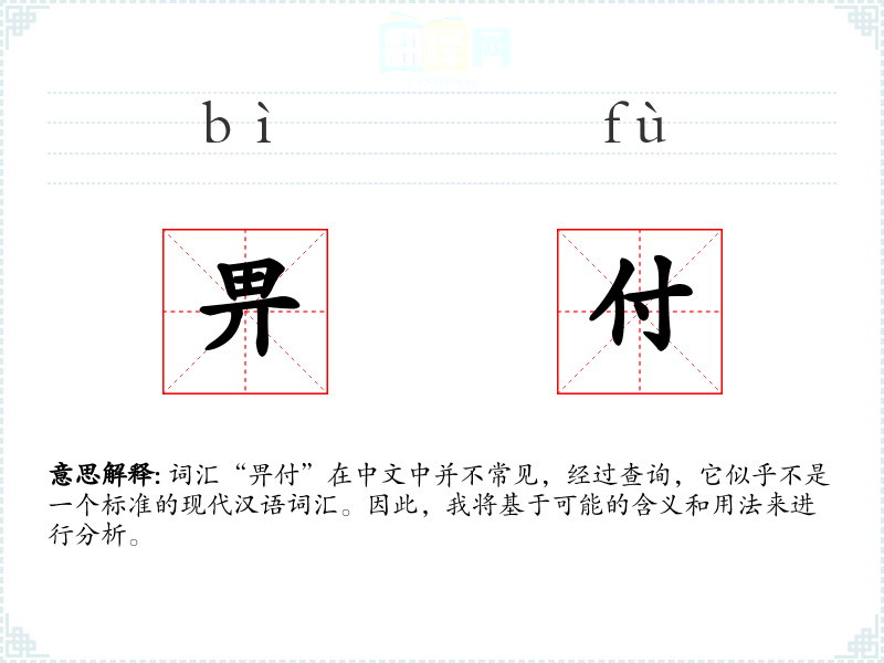 由于“畀付”不是一个常用词汇,它在现代文学、口语或专业领域中很少出现。如果存在,它可能出现在某些地区的方言中,或者在特定的历史文献中。