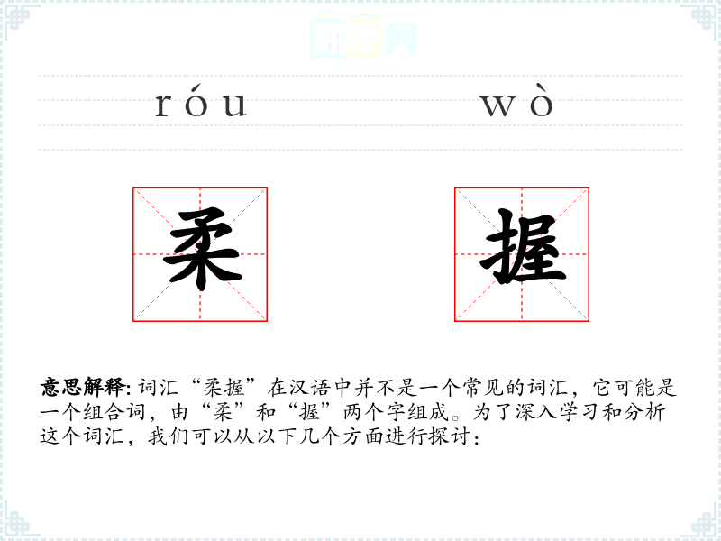 词汇“柔握”在汉语中并不是一个常见的词汇,它可能是一个组合词,由“柔”和“握”两个字组成。为了深入学*和分析这个词汇,我们可以从以下几个方面进行探讨: