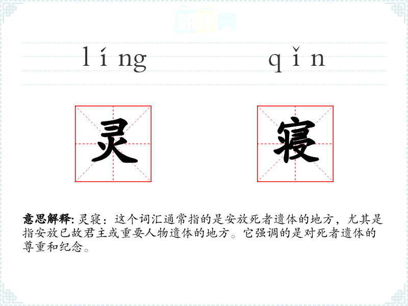 灵寝:这个词汇通常指的是安放死者遗体的地方,尤其是指安放已故君主或重要人物遗体的地方。它强调的是对死者遗体的尊重和纪念。
