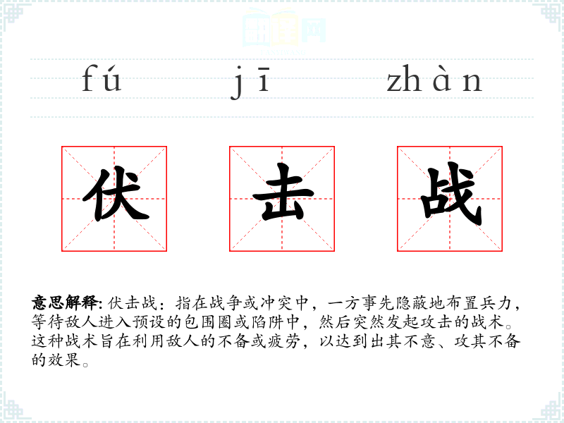 伏击战:指在战争或冲突中,一方事先隐蔽地布置兵力,等待敌人进入预设的包围圈或陷阱中,然后突然发起攻击的战术。这种战术旨在利用敌人的不备或疲劳,以达到出其不意、攻其不备的效果。