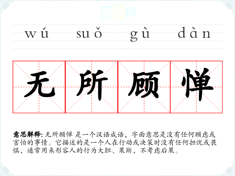 无所顾惮 是一个汉语成语,字面意思是没有任何顾虑或害怕的事情。它描述的是一个人在行动或决策时没有任何担忧或畏惧,通常用来形容人的行为大胆、果断,不考虑后果。