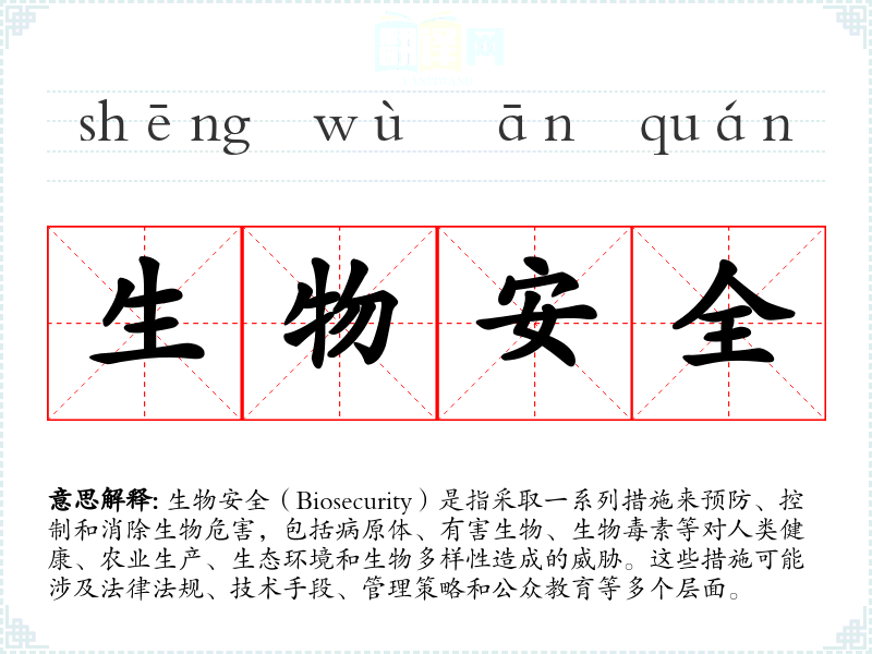 - 专业领域:在生物学、医学、农业和环境科学等领域,生物安全是一个核心概念,涉及实验室安全、疫情管理、转基因生物监管等。