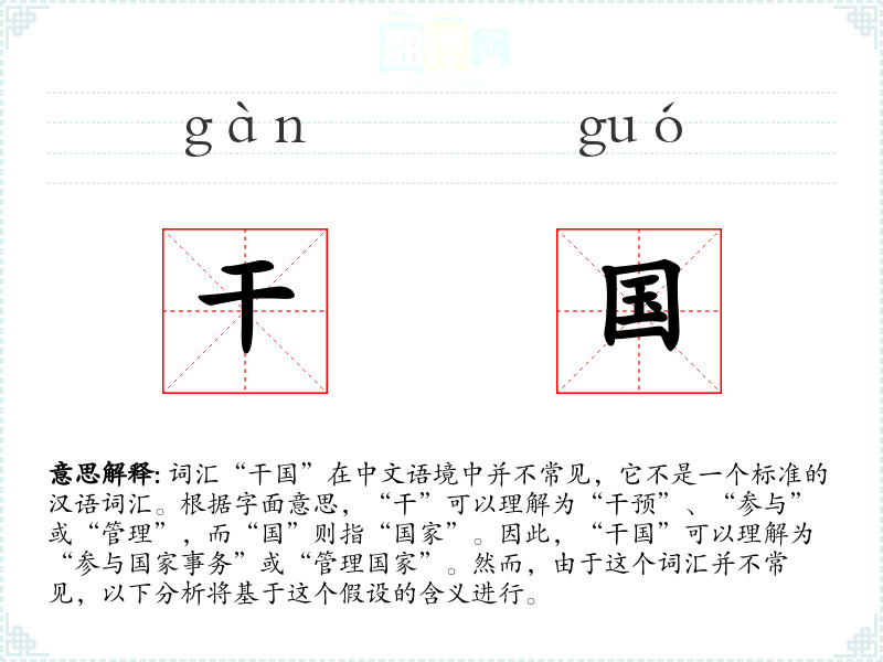 词汇“干国”在中文语境中并不常见,它不是一个标准的汉语词汇。根据字面意思,“干”可以理解为“干预”、“参与”或“管理”,而“国”则指“国家”。因此,“干国”可以理解为“参与国家事务”或“管理国家”。然而,由于这个词汇并不常见,以下分析将基于这个假设的含义进行。