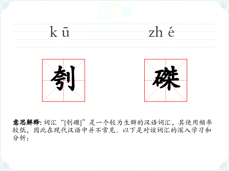 词汇“[刳磔]”是一个较为生僻的汉语词汇,其使用频率较低,因此在现代汉语中并不常见。以下是对该词汇的深入学习和分析:
