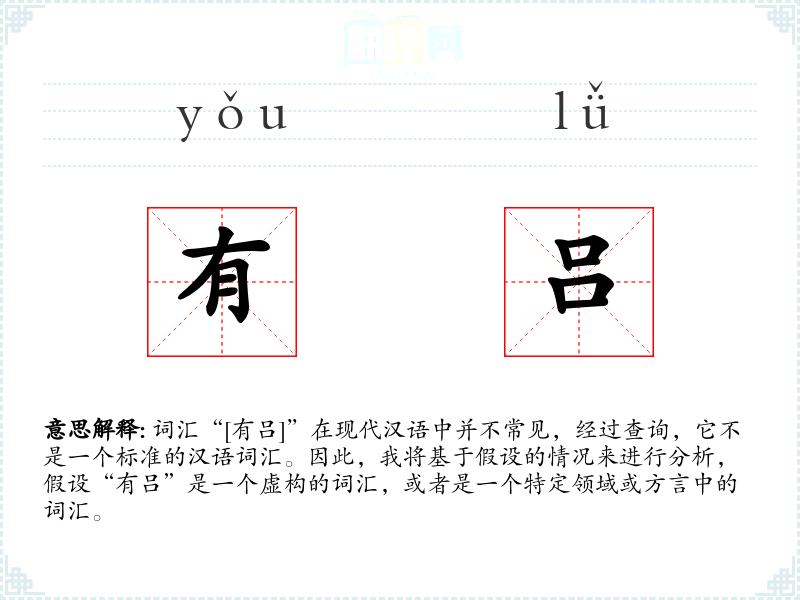 词汇“[有吕]”在现代汉语中并不常见,经过查询,它不是一个标准的汉语词汇。因此,我将基于假设的情况来进行分析,假设“有吕”是一个虚构的词汇,或者是一个特定领域或方言中的词汇。