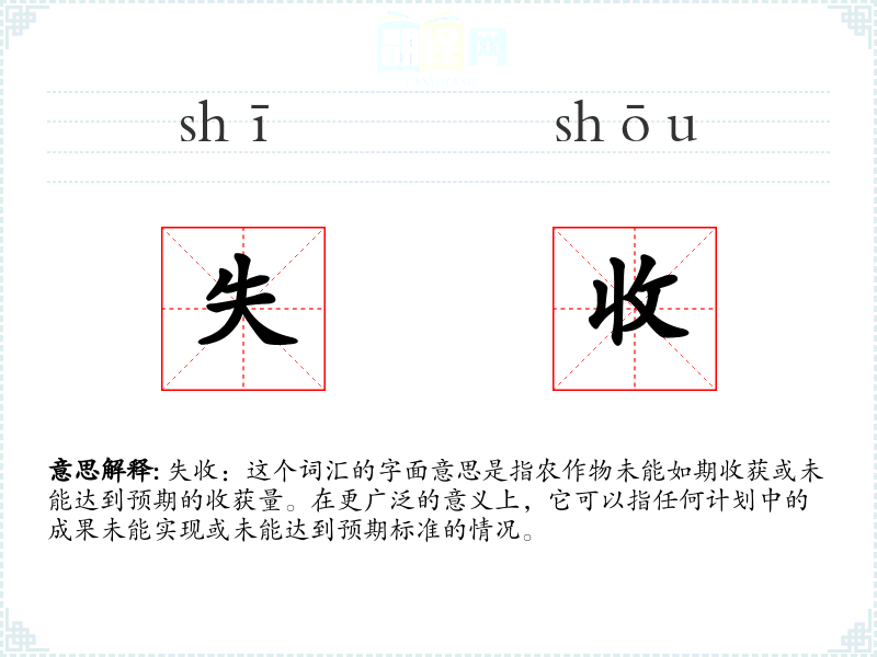 失收:这个词汇的字面意思是指农作物未能如期收获或未能达到预期的收获量。在更广泛的意义上,它可以指任何计划中的成果未能实现或未能达到预期标准的情况。