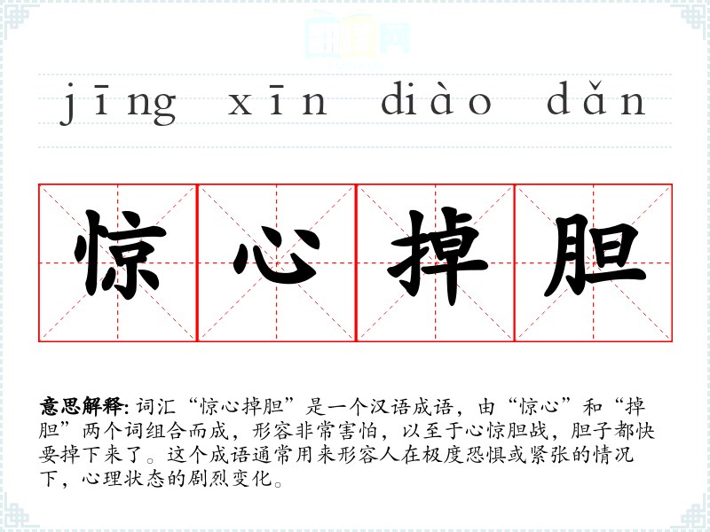 - 词源:这个成语的词源较为模糊,可能是由古代汉语中的“惊心”和“掉胆”两个词组合而成。