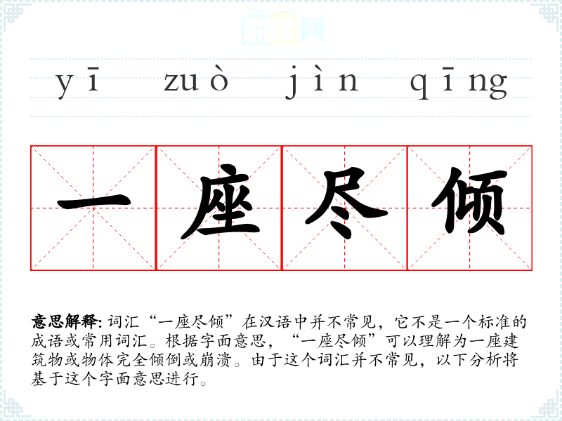 词汇“一座尽倾”在汉语中并不常见,它不是一个标准的成语或常用词汇。根据字面意思,“一座尽倾”可以理解为一座建筑物或物体完全倾倒或崩溃。由于这个词汇并不常见,以下分析将基于这个字面意思进行。