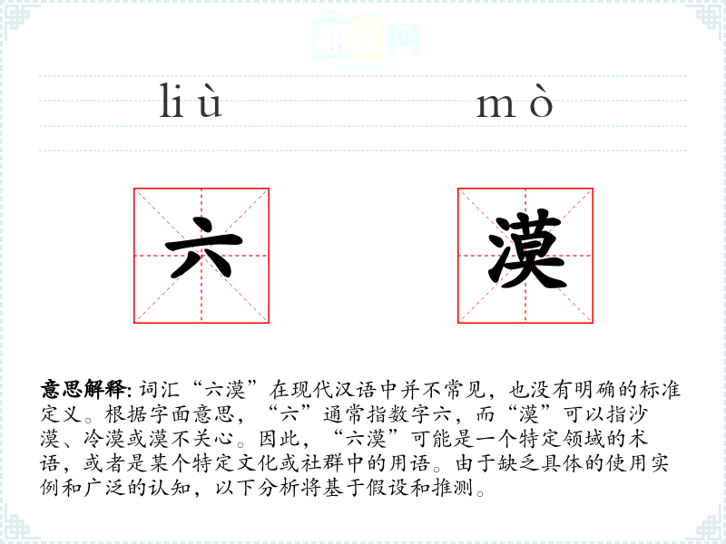 词汇“六漠”在现代汉语中并不常见,也没有明确的标准定义。根据字面意思,“六”通常指数字六,而“漠”可以指沙漠、冷漠或漠不关心。因此,“六漠”可能是一个特定领域的术语,或者是某个特定文化或社群中的用语。由于缺乏具体的使用实例和广泛的认知,以下分析将基于假设和推测。
