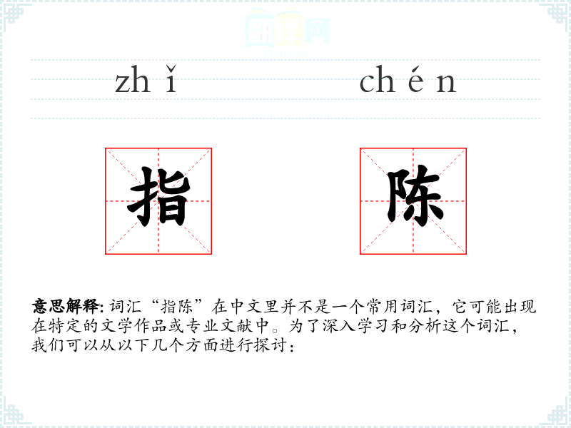 词汇“指陈”在中文里并不是一个常用词汇,它可能出现在特定的文学作品或专业文献中。为了深入学*和分析这个词汇,我们可以从以下几个方面进行探讨: