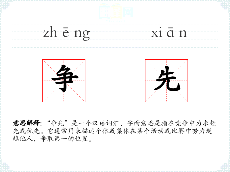 “争先”是一个汉语词汇,字面意思是指在竞争中力求领先或优先。它通常用来描述个体或集体在某个活动或比赛中努力超越他人,争取第一的位置。