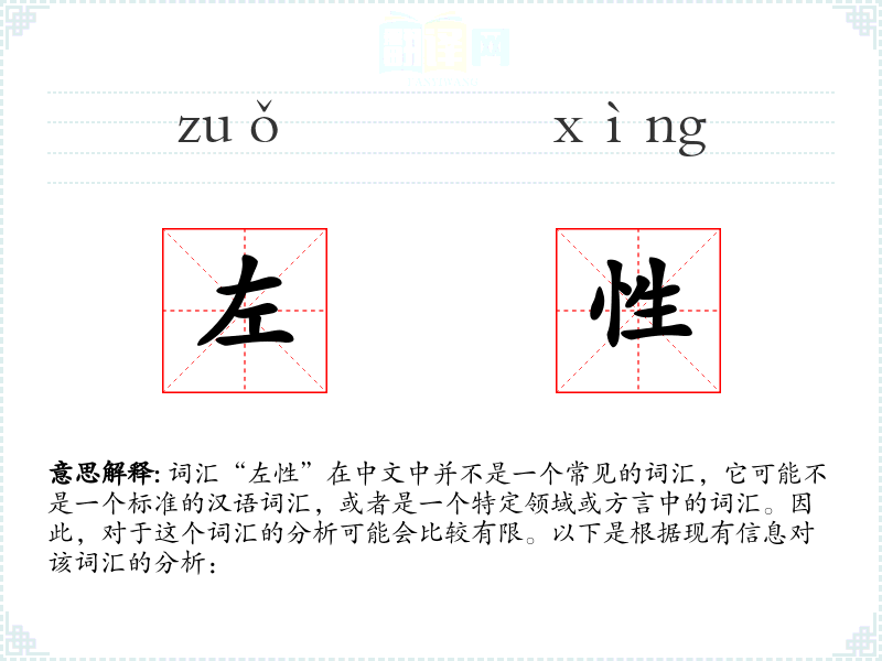 由于“左性”不是一个常见词汇,对其的理解和应用可能需要更多的背景知识和特定语境。在语言学习和表达中,了解词汇的具体含义和用法是非常重要的。如果“左性”是在特定领域或方言中的词汇,那么对其的理解可能需要更深入的研究和实践。