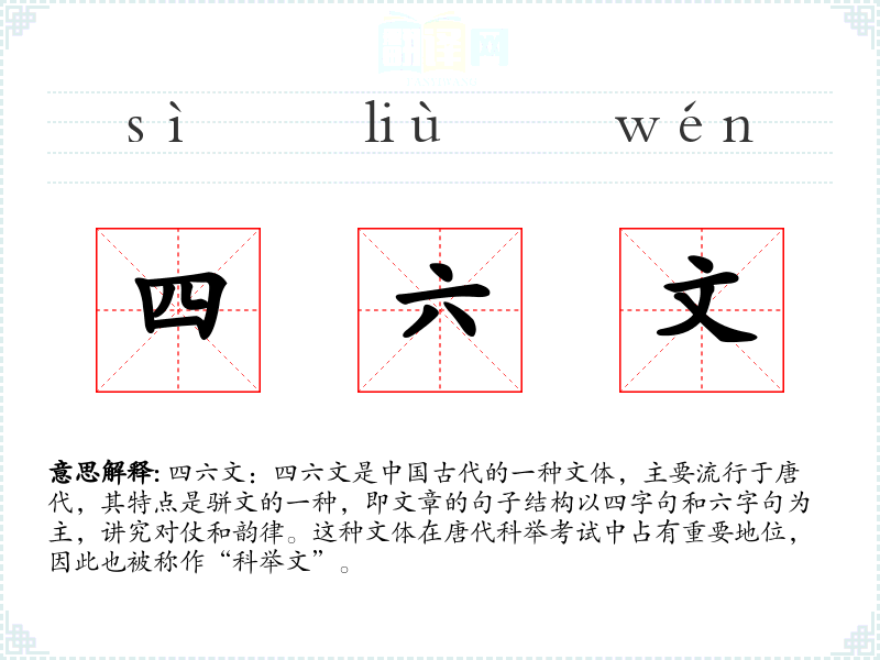 同义词:骈文、律诗(在某种程度上,律诗也讲究对仗和韵律,与四六文有相似之处) 反义词:散文(散文不拘泥于特定的句式和韵律,与四六文的严谨形式形成对比)