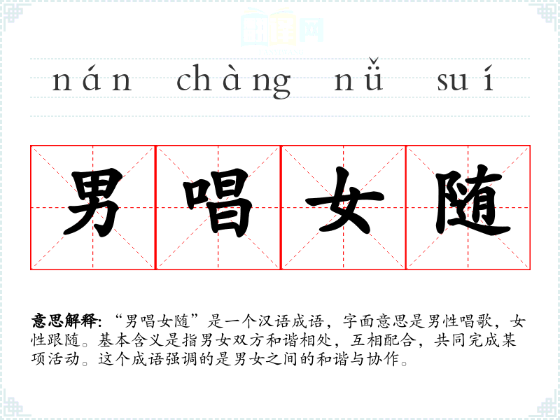 “男唱女随”是一个汉语成语,字面意思是男性唱歌,女性跟随。基本含义是指男女双方和谐相处,互相配合,共同完成某项活动。这个成语强调的是男女之间的和谐与协作。