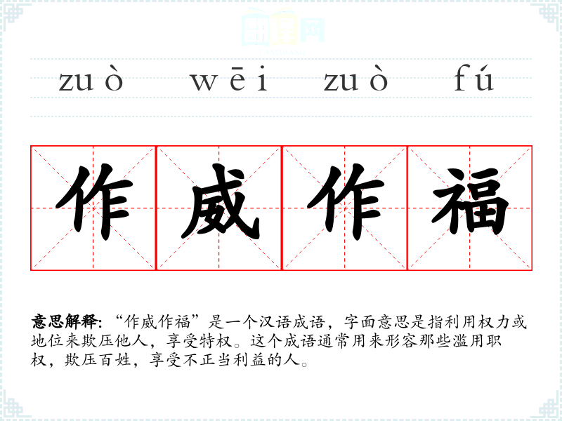 “作威作福”是一个汉语成语,字面意思是指利用权力或地位来欺压他人,享受特权。这个成语通常用来形容那些滥用职权,欺压百姓,享受不正当利益的人。