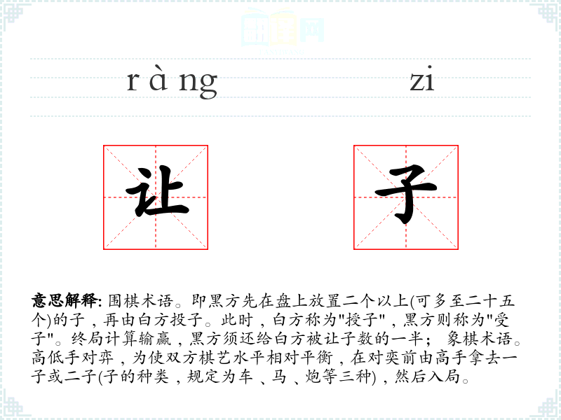 1.围棋术语。即黑方先在盘上放置二个以上(可多至二十五个)的子﹐再由白方投子。此时﹐白方称为"授子"﹐黑方则称为"受子"。终局计算输赢﹐黑方须还给白方被让子数的一半; 象棋术语。高低手对弈﹐为使双方棋艺水平相对平衡﹐在对奕前由高手拿去一子或二子(子的种类﹐规定为车﹑马﹑炮等三种)﹐然后入局。