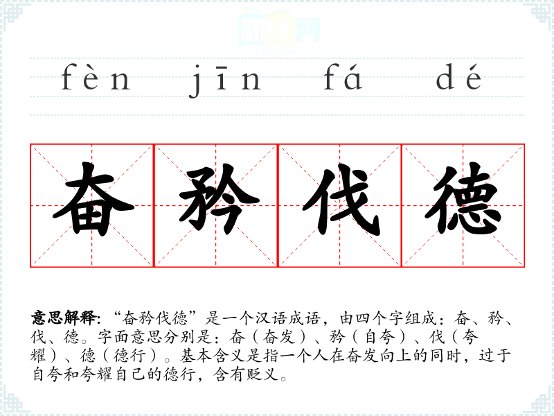 “奋矜伐德”是一个汉语成语,由四个字组成:奋、矜、伐、德。字面意思分别是:奋(奋发)、矜(自夸)、伐(夸耀)、德(德行)。基本含义是指一个人在奋发向上的同时,过于自夸和夸耀自己的德行,含有贬义。