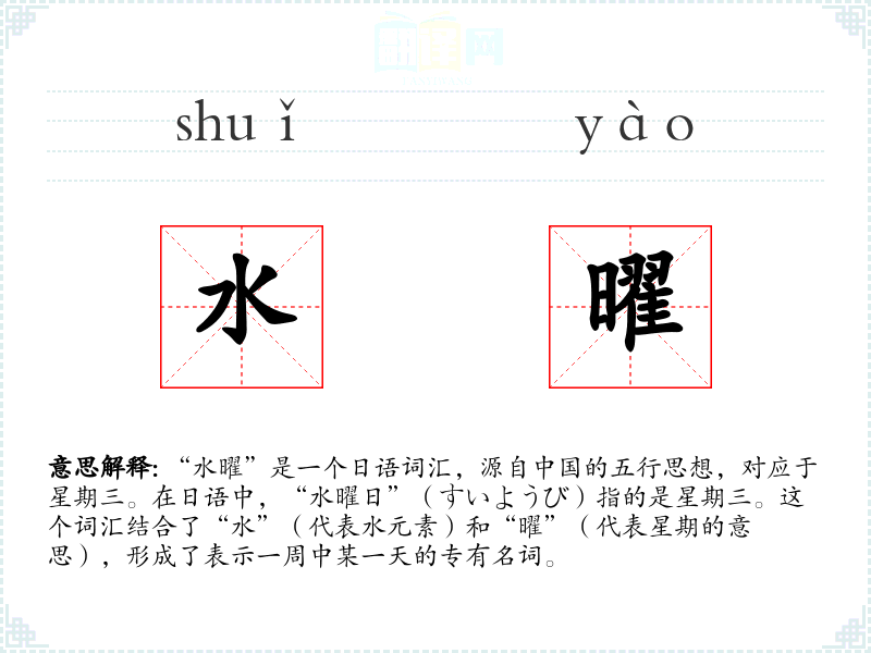 “水曜”是一个日语词汇,源自**的五行思想,对应于星期三。在日语中,“水曜日”(すいようび)指的是星期三。这个词汇结合了“水”(代表水元素)和“曜”(代表星期的意思),形成了表示一周中某一天的专有名词。