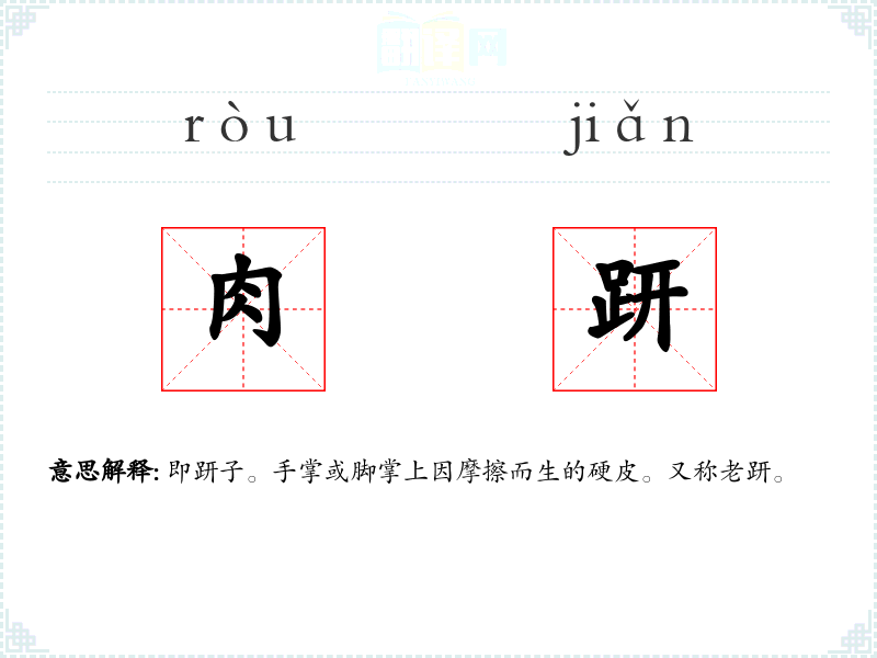 即趼子。手掌或脚掌上因摩擦而生的硬皮。又称老趼。