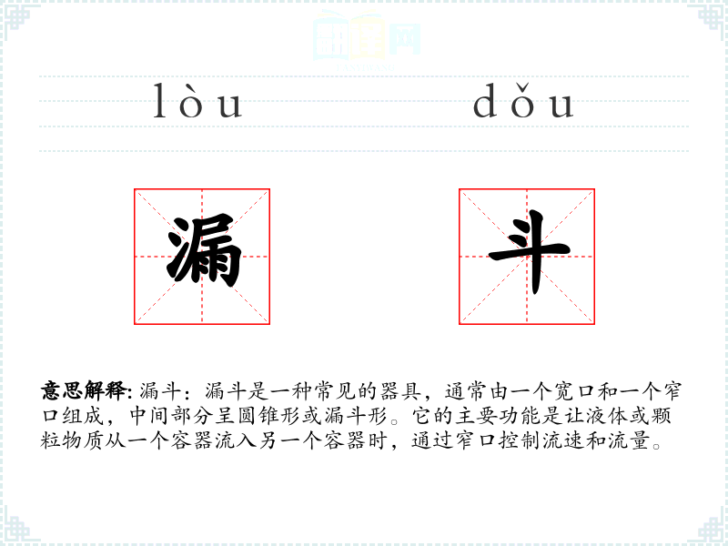 漏斗:漏斗是一种常见的器具,通常由一个宽口和一个窄口组成,中间部分呈圆锥形或漏斗形。它的主要功能是让液体或颗粒物质从一个容器流入另一个容器时,通过窄口控制流速和流量。
