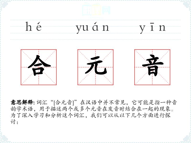 在音韵学和语言学专业领域,“合元音”是一个重要的概念,用于分析和描述语音的结构和变化。在日常口语和文学作品中,这个概念可能不会直接提及,但了解它有助于更准确地发音和理解某些语言现象。