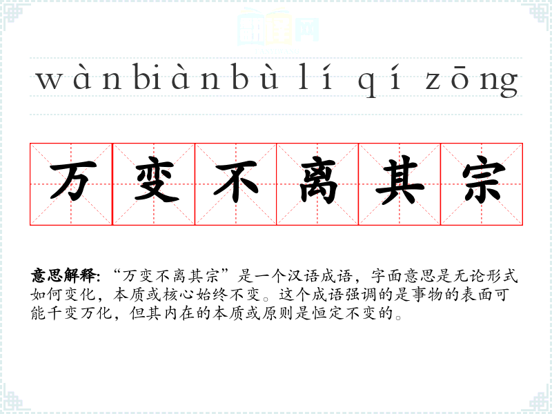 “万变不离其宗”是一个汉语成语,字面意思是无论形式如何变化,本质或核心始终不变。这个成语强调的是事物的表面可能千变万化,但其内在的本质或原则是恒定不变的。