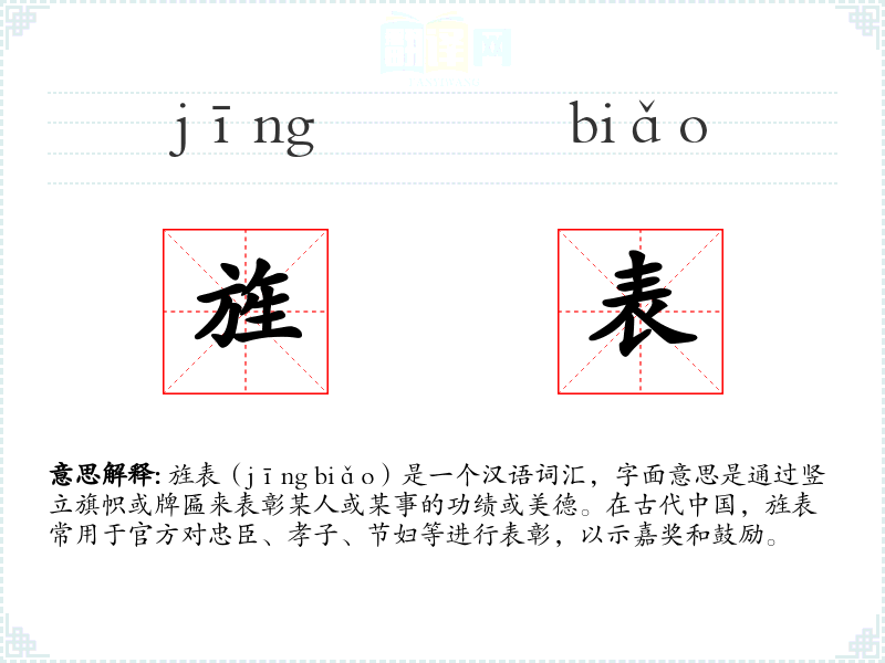 - 文学:在古典文学中,旌表常用于描述官方对英雄人物的表彰,如《史记》中对忠臣的记载。