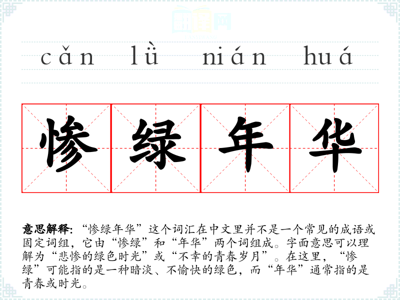 “惨绿年华”这个词汇在中文里并不是一个常见的成语或固定词组,它由“惨绿”和“年华”两个词组成。字面意思可以理解为“悲惨的绿色时光”或“不幸的青春岁月”。在这里,“惨绿”可能指的是一种暗淡、不愉快的绿色,而“年华”通常指的是青春或时光。