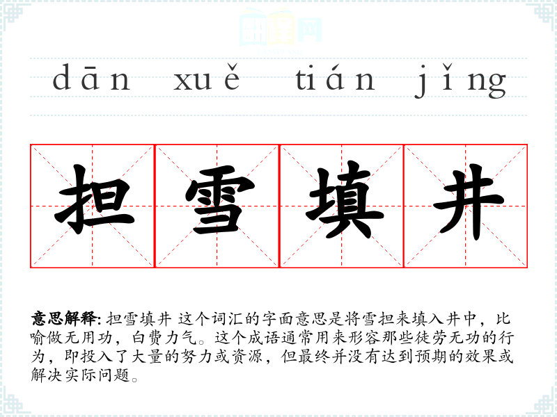 担雪填井 这个词汇的字面意思是将雪担来填入井中,比喻做无用功,白费力气。这个成语通常用来形容那些徒劳无功的行为,即投入了大量的努力或资源,但最终并没有达到预期的效果或解决实际问题。