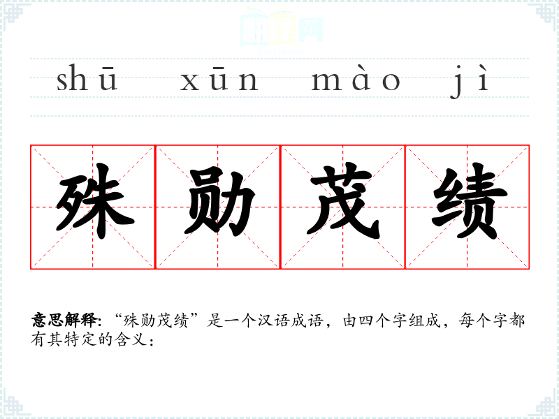 “殊勋茂绩”是一个汉语成语,由四个字组成,每个字都有其特定的含义: