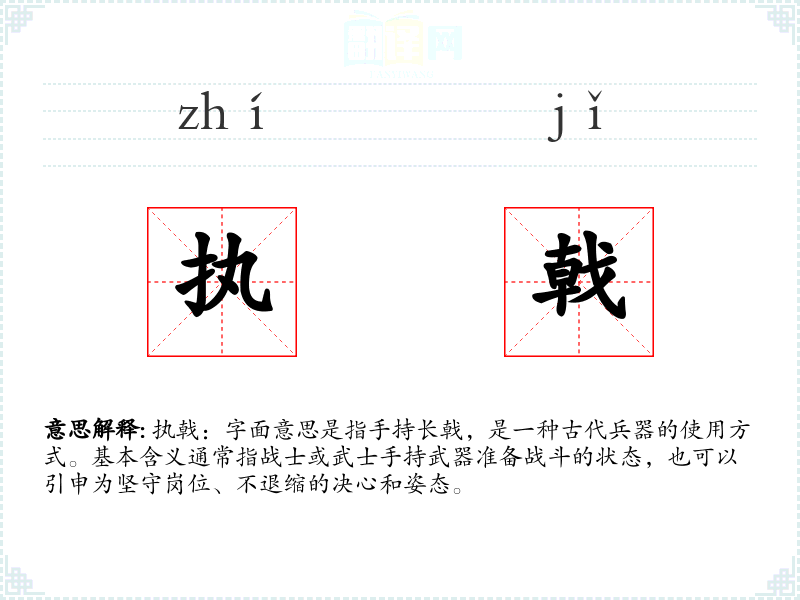 执戟:字面意思是指手持长戟,是一种古代兵器的使用方式。基本含义通常指战士或武士手持武器准备战斗的状态,也可以引申为坚守岗位、不退缩的决心和姿态。