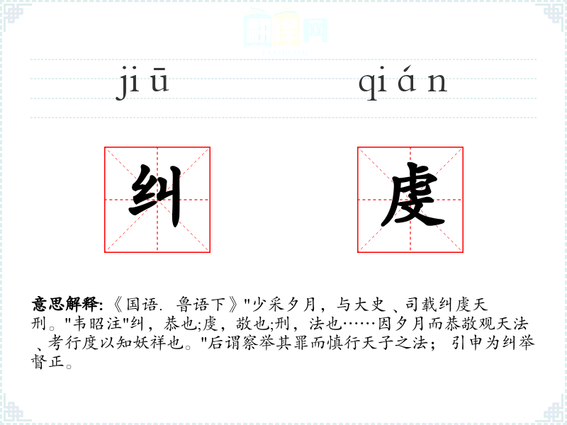 《国语.鲁语下》"少采夕月,与大史﹑司载纠虔天刑。"韦昭注"纠,恭也;虔,敬也;刑,法也……因夕月而恭敬观天法﹑考行度以知妖祥也。"后谓察举其罪而慎行天子之法; 引申为纠举督正。