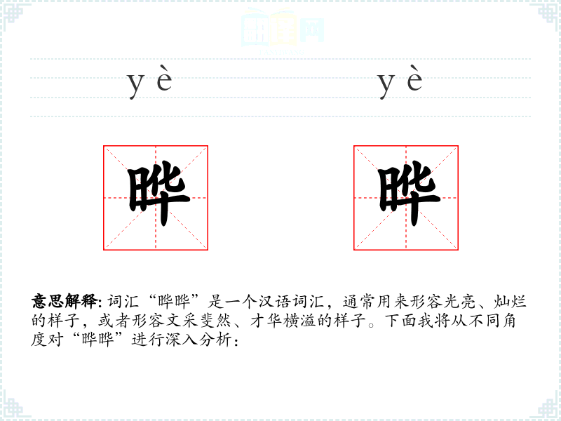 词汇“晔晔”是一个汉语词汇,通常用来形容光亮、灿烂的样子,或者形容文采斐然、才华横溢的样子。下面我将从不同角度对“晔晔”进行深入分析: