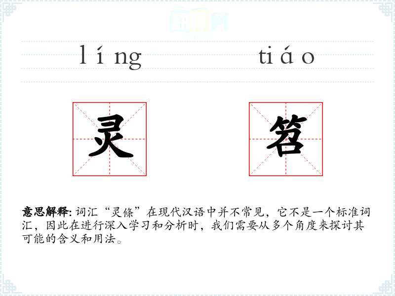 “灵條”一词的字面意思并不明确,因为它不是一个常用词汇。根据字面拆解,“灵”通常指灵性、灵巧或灵异,而“條”则常指条状物或条款。因此,“灵條”可能指的是具有灵性的条状物,或者是指某种灵活、灵巧的条款或规则。