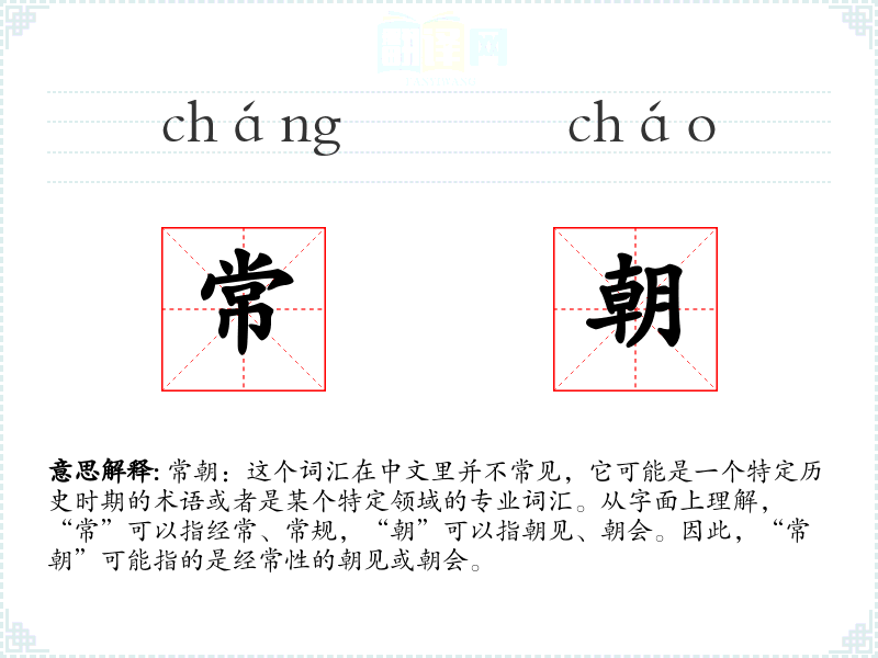 由于“常朝”不是一个现代常用词汇,它可能出现在历史文献或特定的历史小说中,描述古代**或君主定期举行的朝会。在现代口语或专业领域中,这个词汇几乎不会被使用。